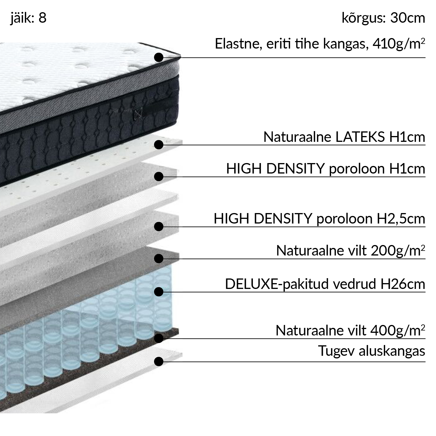 Atsperu matracis HARMONY DELUX 90x200xH30cm, iepakots rullī